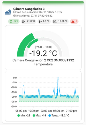 - Gráfico: Grafico de las temperaturas registradas en el periodo con los límites configurados del sensor para fácil visualización de las desviaciones.