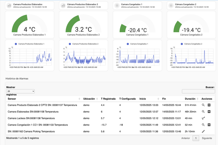 En este panel podrá observar cada uno de los registradores, tanto en tiempo real como el histórico de las últimas 24 horas (este periodo es configurable para cada sonda).